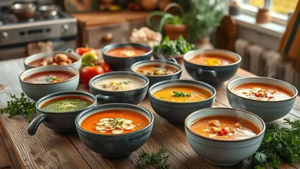 Cardápio de sopas oferece opções para todos os gostos e necessidades, desde clássicas como canja e caldo verde até receitas rápidas, veganas e imunológicas. Inclui dicas práticas de preparo, congelamento e reaproveitamento de sobras para refeições saborosas e nutritivas em qualquer época do ano.