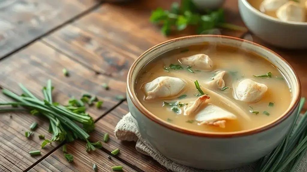 Adicione 1 colher de chá de molho de soja ou 1 pitada de açúcar mascavo ao caldo – esses ingredientes realçam o umami natural do frango sem dominar o sabor. Um dente de alho inteiro esmagado no final do cozimento também acrescenta profundidade ao caldo.