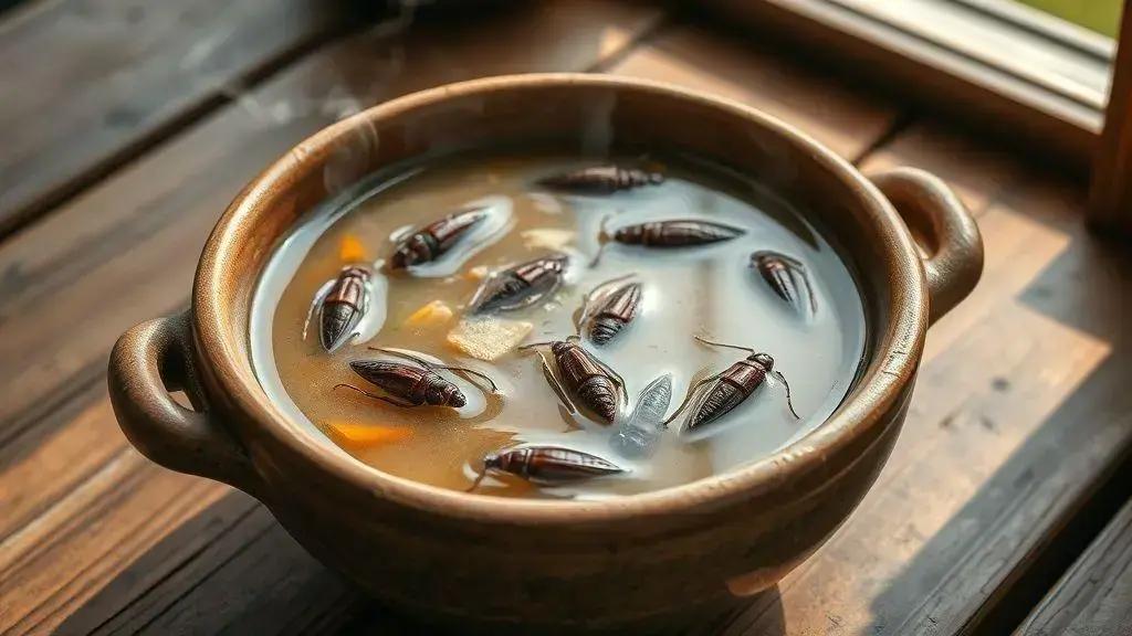 A sopa de barata é uma iguaria tradicional do sudeste asiático preparada com espécies específicas de insetos criados para consumo humano, oferecendo alto valor proteico (60-70% de proteína completa) e nutrientes como vitaminas do complexo B, ferro e ácidos graxos benéficos, exigindo cuidados especiais de seleção, higiene e cozimento adequado para consumo seguro.