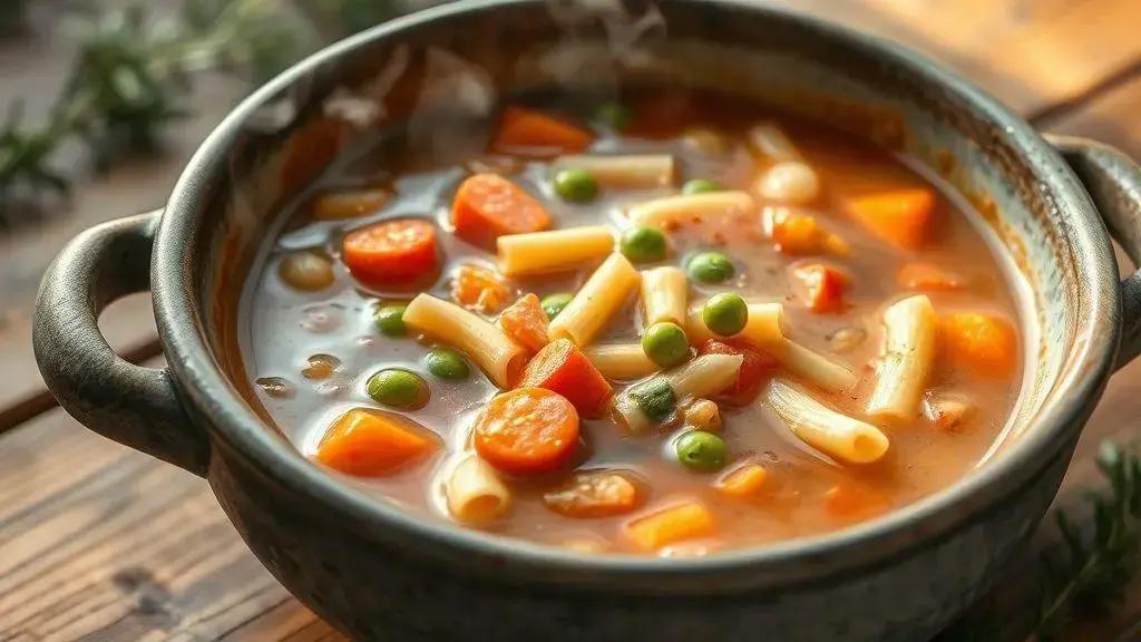 A sopa de legumes com macarrão simples é uma receita prática e econômica que combina legumes frescos, macarrão e temperos básicos, resultando em uma refeição nutritiva e reconfortante perfeita para toda a família, podendo ser adaptada com ingredientes disponíveis em casa.