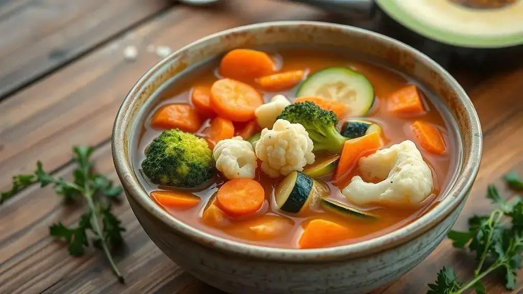Sopa de legumes low carb é uma preparação nutritiva com baixo teor de carboidratos que utiliza vegetais como brócolis, couve-flor e abobrinha, promovendo saciedade e auxiliando no controle de peso através do alto conteúdo de fibras e proteínas magras.